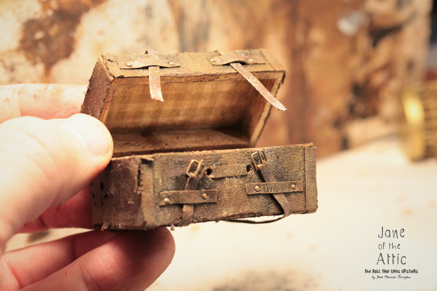 The trunk was a 'ready made' which I bought at a miniatures fair, and then weathered to smithereens. When I was done, the poor thing did look like something completely different, but much more suitable for the attic! Below are several pictures of it after the weathering, including some showing my hand for measurement (all you need to remember is that I have BIG hands, ok..?).